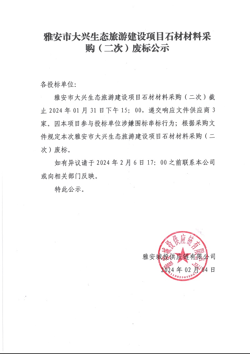 雅安市大興生態(tài)旅游建設(shè)項目石材材料采購(二次)廢標公示