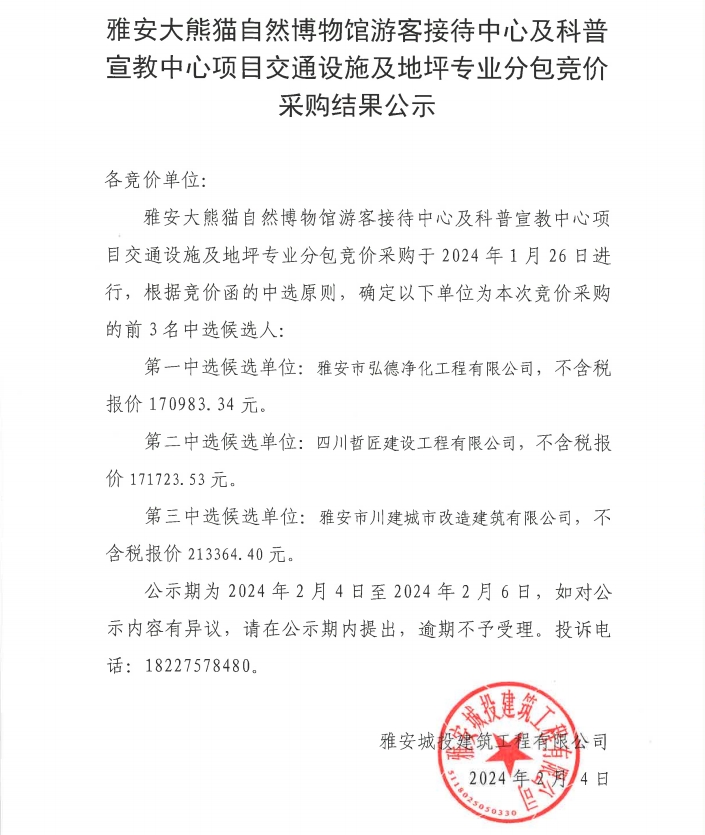 雅安市大熊貓自然博物館游客接待中心及科普宣教中心項(xiàng)目交通設(shè)施及地坪專業(yè)分包競價采購結(jié)果公示