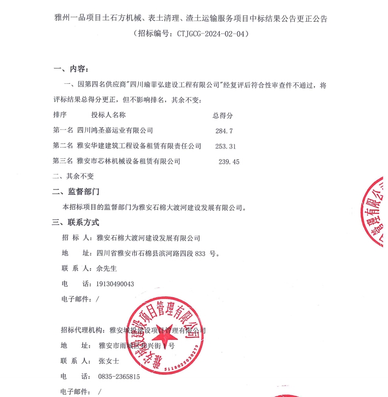 雅州一品項(xiàng)目土石方機(jī)械、表土清理、渣土運(yùn)輸服務(wù)項(xiàng)目中標(biāo)結(jié)果公告更正公告
