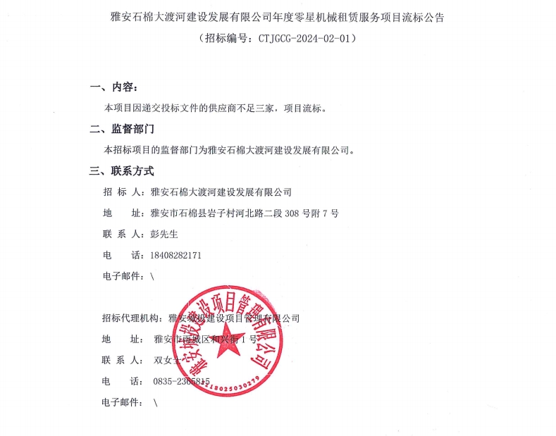 雅安石棉大渡河建設(shè)發(fā)展有限公司年度零星機械租賃服務(wù)項目流標(biāo)公告