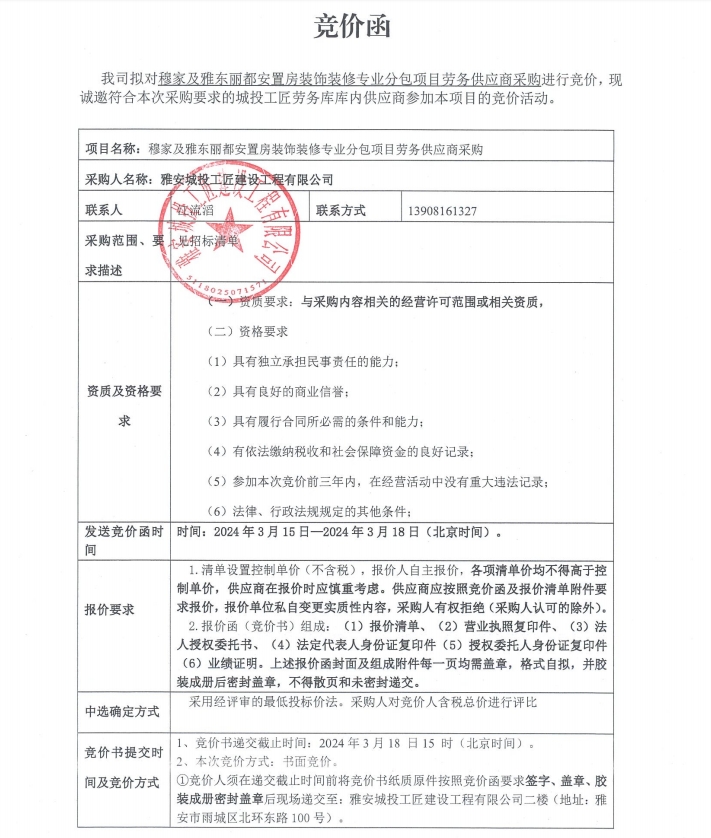 穆家及雅東麗都安置房裝飾裝修專業(yè)分包項(xiàng)目勞務(wù)供應(yīng)商采購(gòu)競(jìng)價(jià)公告