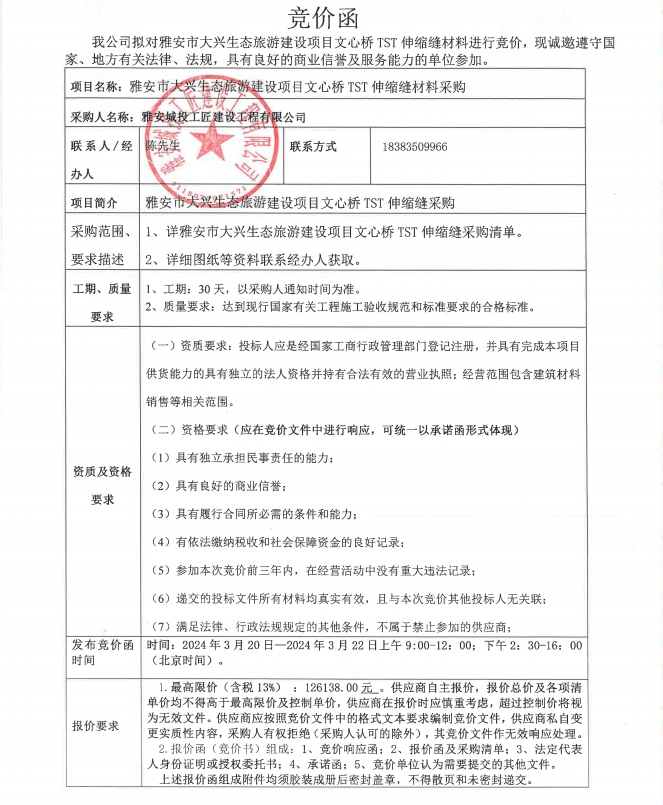 雅安市大興生態(tài)旅游建設(shè)項(xiàng)目文心橋TST橋梁伸縮縫材料采購競價(jià)公告