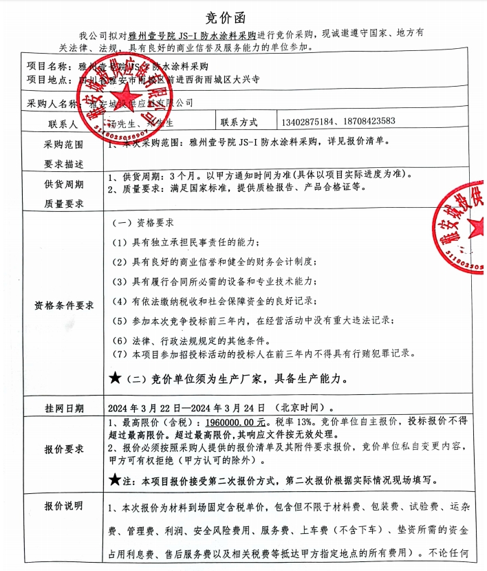雅州壹號院JS-I防水涂料采購競價公告