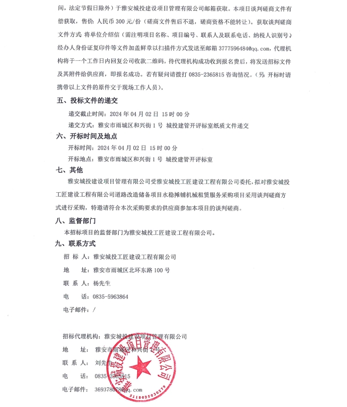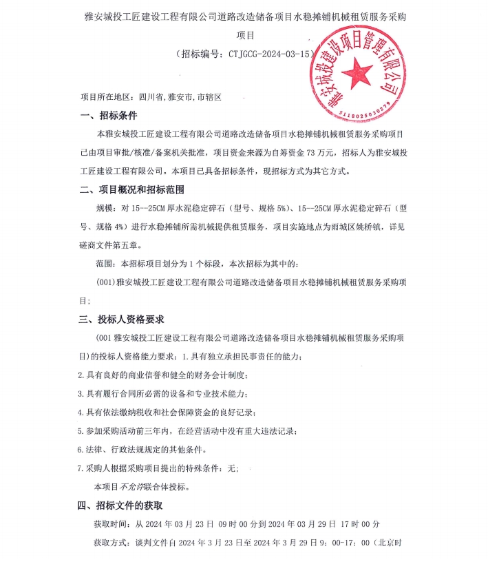 雅安城投工匠建設(shè)工程有限公司道路改造儲備項(xiàng)目水穩(wěn)攤鋪機(jī)械租賃服務(wù)采購項(xiàng)目公告