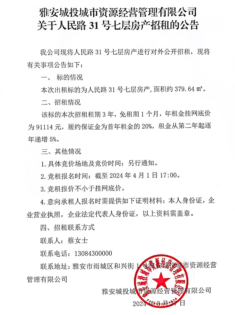 雅安城投城市資源經(jīng)營(yíng)管理有限公司關(guān)于人民路31號(hào)七層房產(chǎn)招租的公告