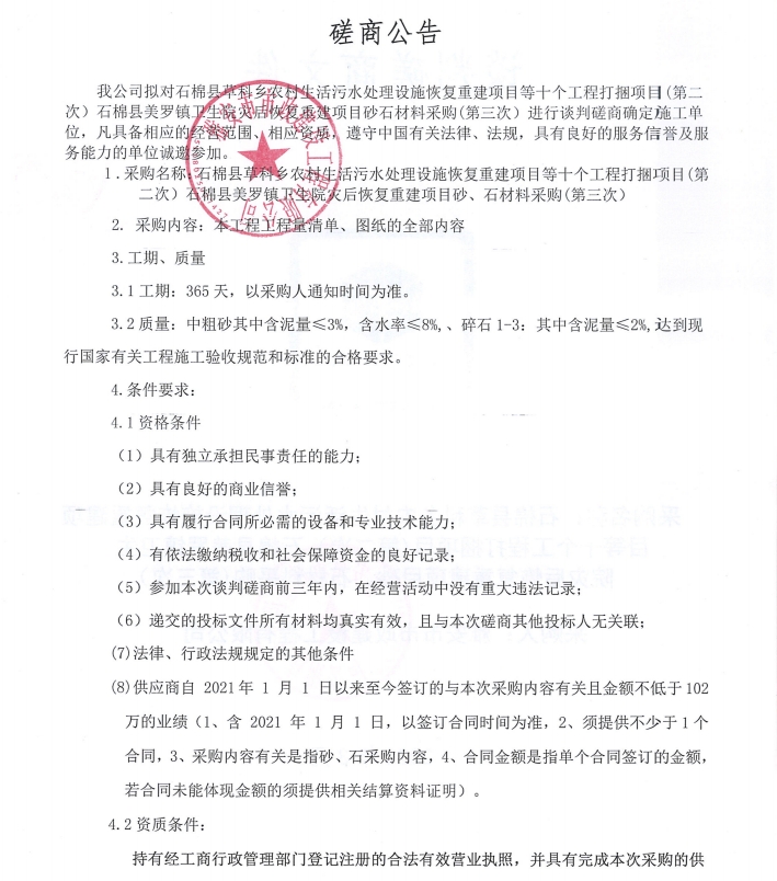 石棉縣草科鄉(xiāng)農(nóng)村生活污水處理設(shè)施恢復(fù)重建項(xiàng)目等十個(gè)工程打捆項(xiàng)目(第二次)、石棉縣美羅鎮(zhèn)衛(wèi)生院災(zāi)后恢復(fù)重建項(xiàng)目砂石材料采購(第三次)磋商公告