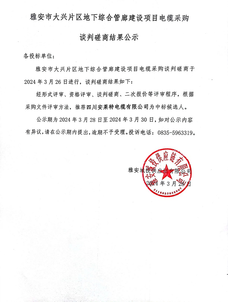 雅安市大興片區(qū)地下綜合管廊建設(shè)項(xiàng)目電纜采購談判磋商結(jié)果公示