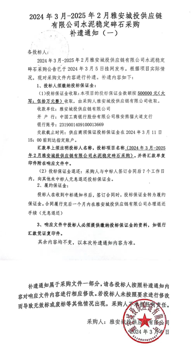 2024年3月-2025年2月雅安城投供應(yīng)鏈有限公司水泥穩(wěn)定碎石采購補遺通知(一)