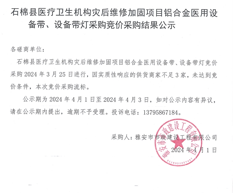 石棉縣醫(yī)療衛(wèi)生機構災后維修加固項目鋁合金醫(yī)用設備帶、設備帶燈采購競價采購結果公示