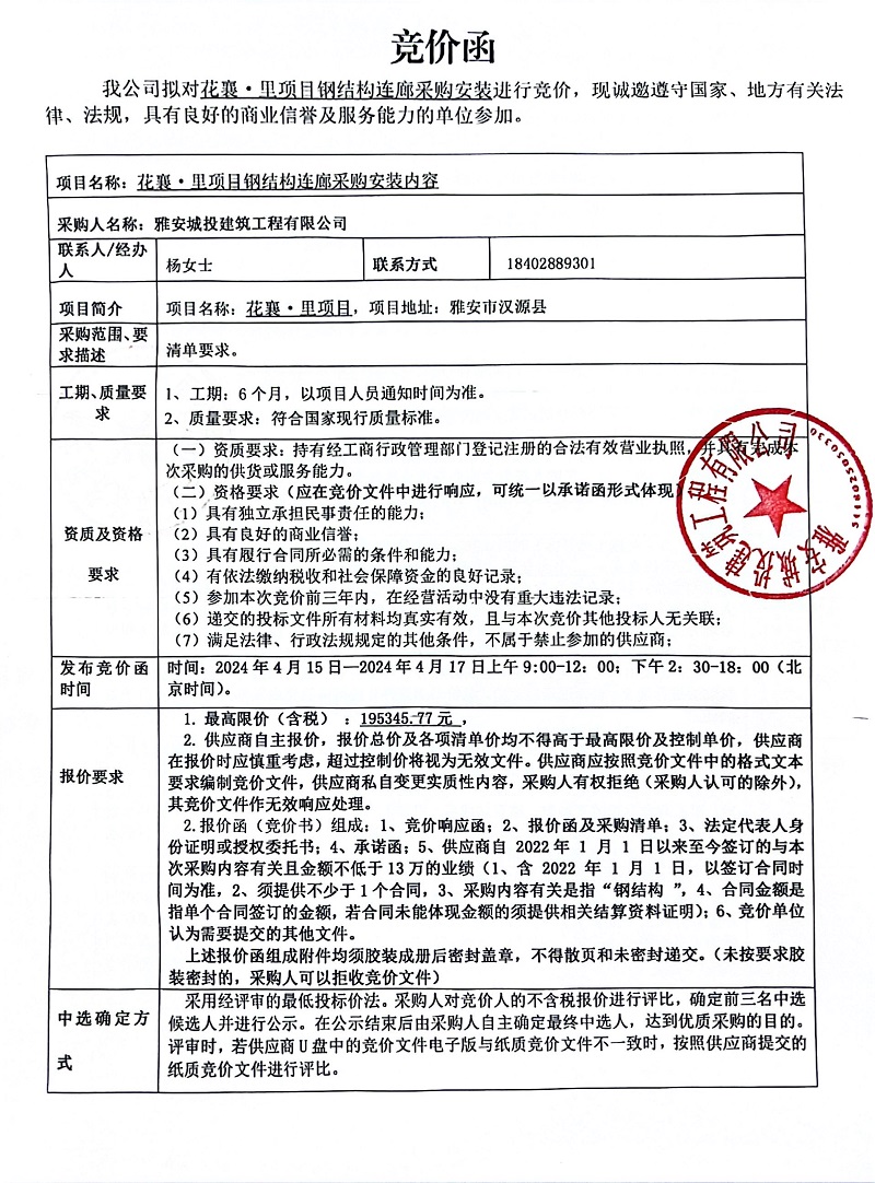 花襄·里項目鋼結(jié)構(gòu)連廊采購安裝競價公告