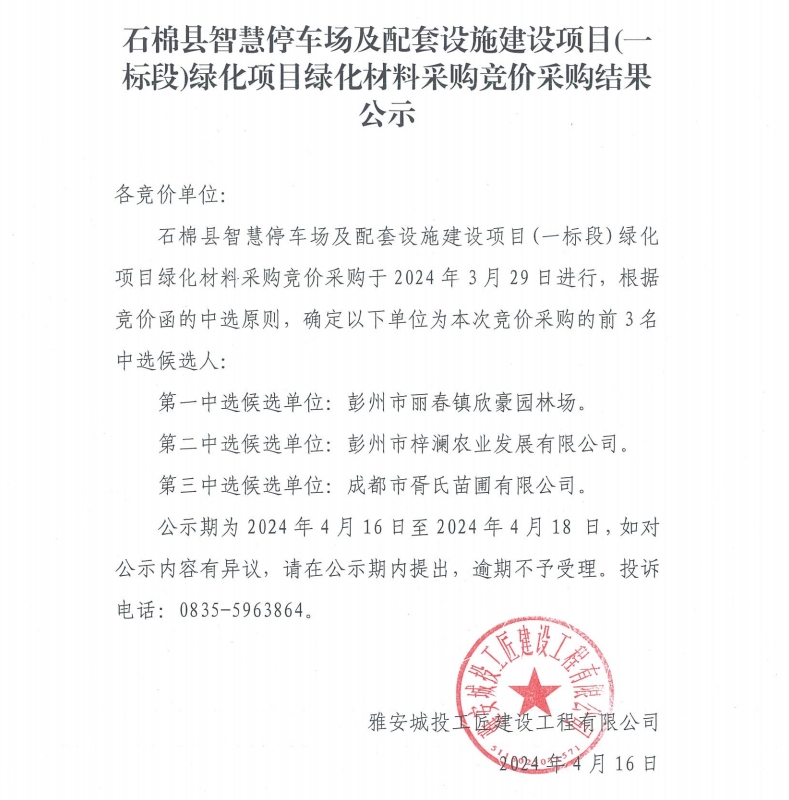 石棉縣智慧停車場及配套設施建設項目(一標段)綠化項目綠化材料采購競價采購結果公示