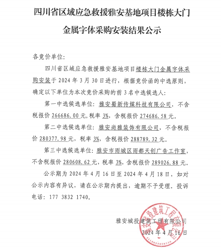 四川省區(qū)域應(yīng)急救援雅安基地項(xiàng)目樓棟大門金屬字體采購(gòu)安裝結(jié)果公示