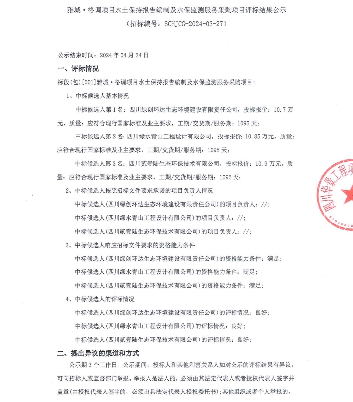 雅城·格調(diào)項目水土保持報告編制及水保監(jiān)測服務(wù)采購項目評標(biāo)結(jié)果公示