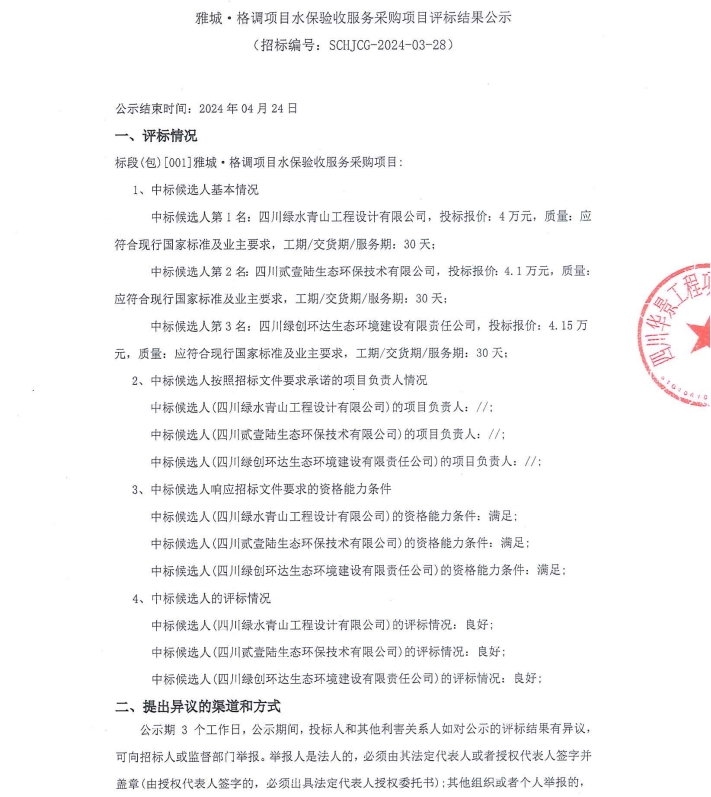 雅城·格調(diào)項目水保驗收服務(wù)采購項目評標(biāo)結(jié)果公示
