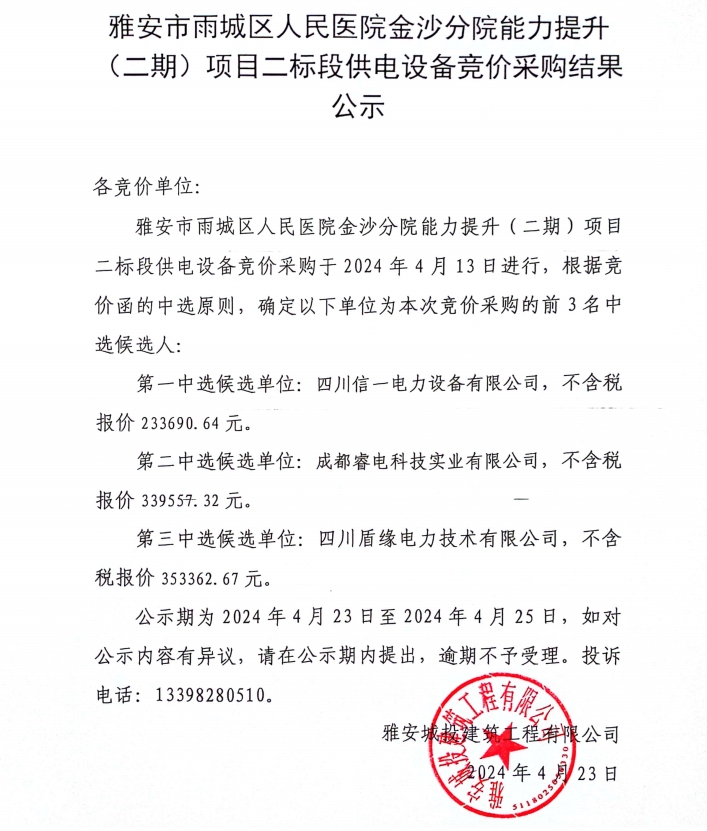 雅安市雨城區(qū)人民醫(yī)院金沙分院能力提升(二期)項目二標段供電設備競價采購結果公示