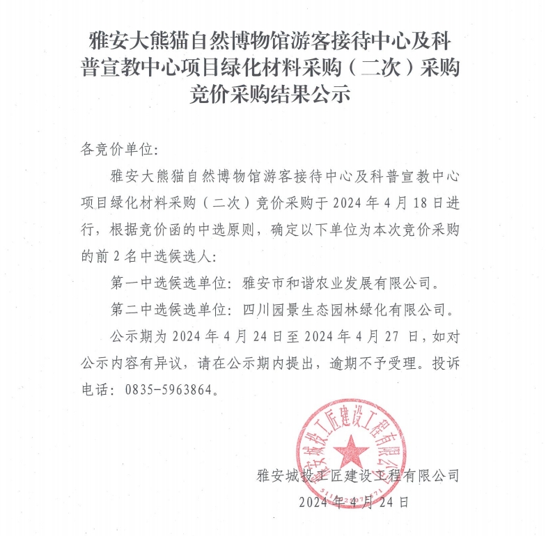 雅安大熊貓自然博物館游客接待中心及科普宣教中心項(xiàng)目綠化材料采購(二次)競價(jià)采購結(jié)果公示