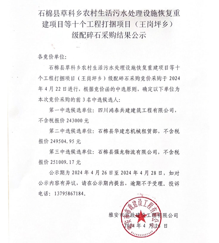 石棉縣草科鄉(xiāng)農村生活污水處理設施恢復重建項目等十個工程打捆項目(王崗坪鄉(xiāng))級配碎石采購結果公示