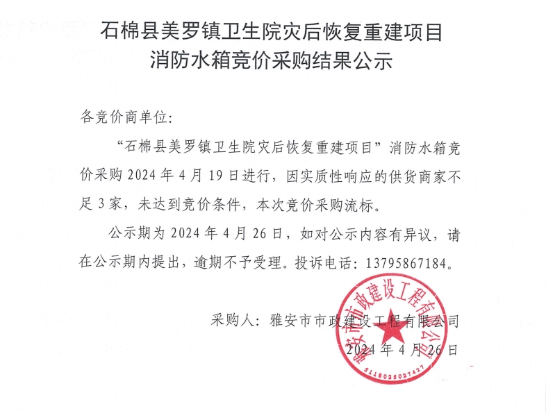石棉縣美羅鎮(zhèn)衛(wèi)生院災后恢復重建項目消防水箱材料競價采購結果公示