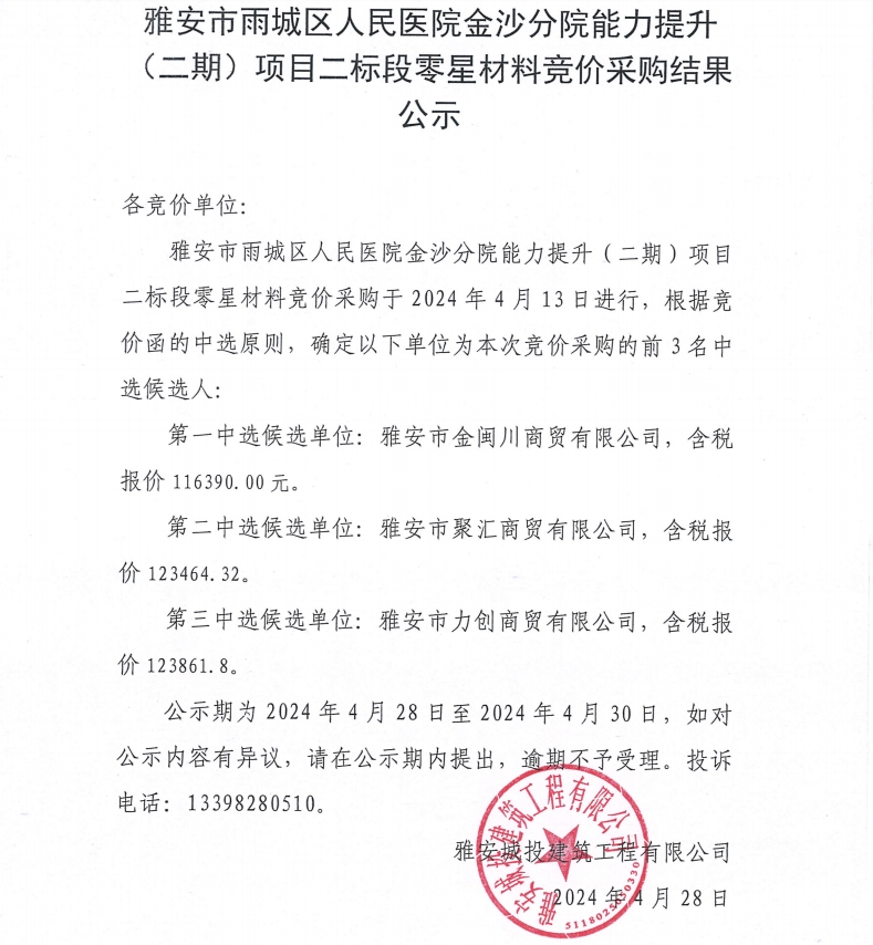 雅安市雨城區(qū)人民醫(yī)院金沙分院能力提升(二期)項目二標段零星材料競價采購結(jié)果公示