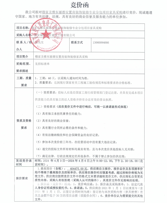 穆家及雅東麗都安置房裝飾裝修專業(yè)分包項目家具采購競價公告