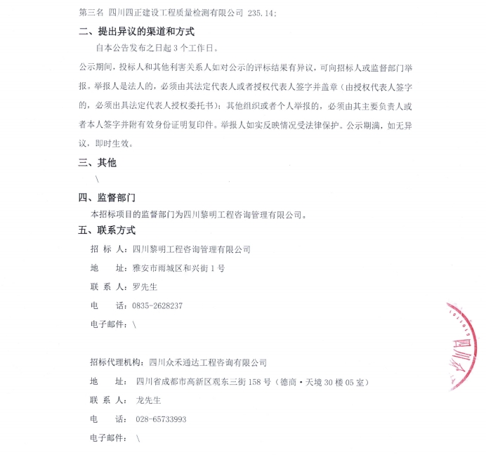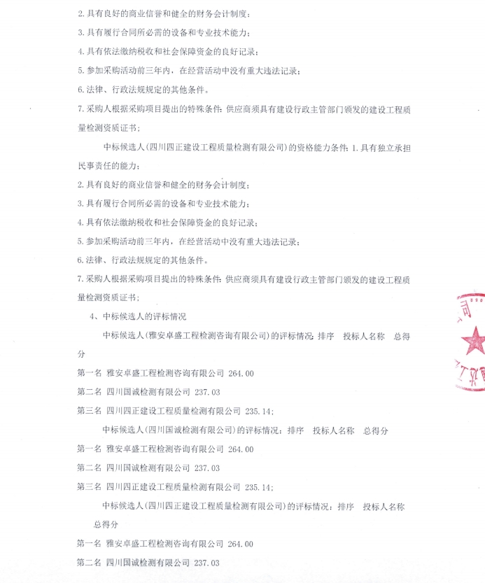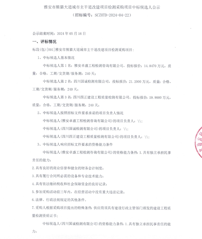 雅安市熊貓大道城市主干道改建項目檢測采購項目中標(biāo)候選人公示