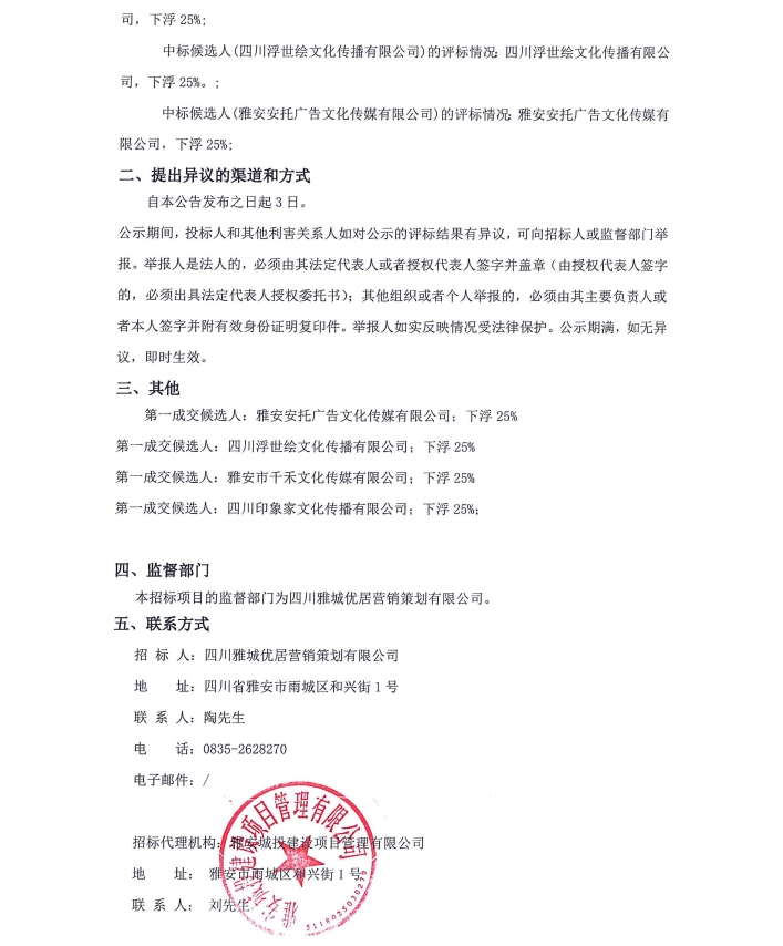 2024年四川雅城優(yōu)居營銷策劃有限公司年度廣告制作服務(wù)項(xiàng)目中標(biāo)候選人公示