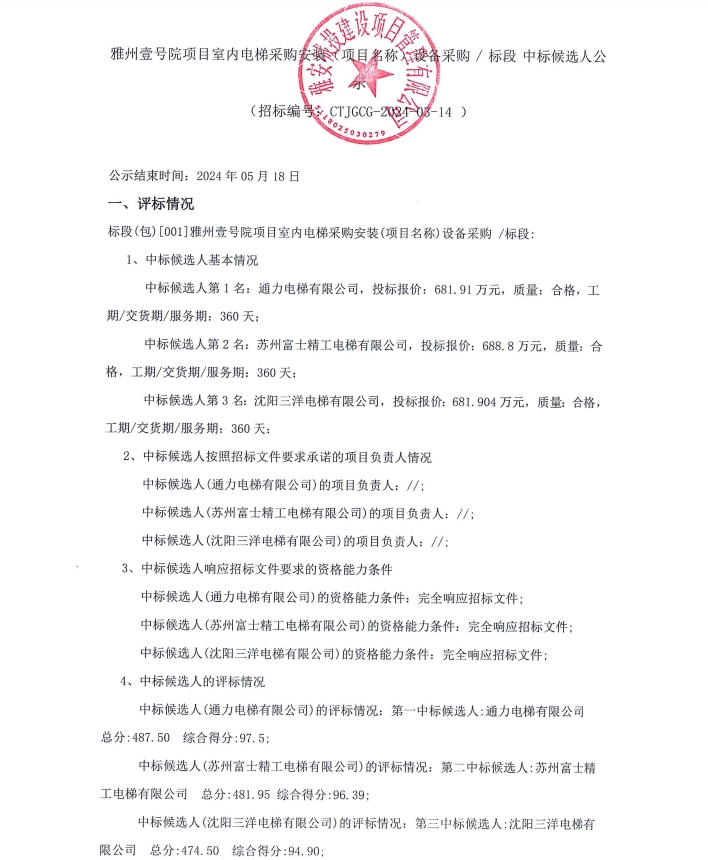 雅州壹號院項目室內(nèi)電梯采購安裝(項目名稱)設(shè)備采購/標段中標候選人公示