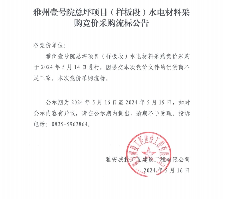 雅州壹號院總坪項目(樣板段)水電材料采購競價采購流標公告