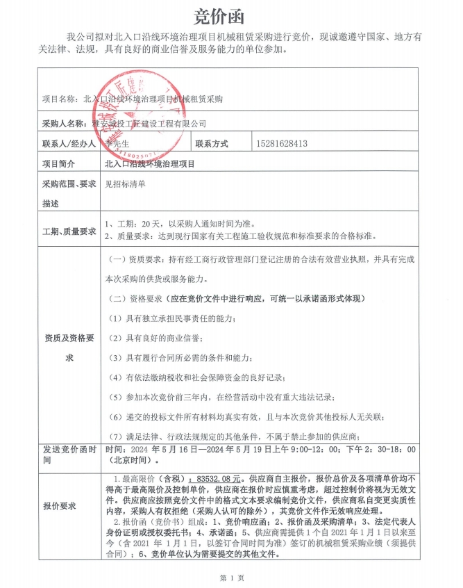 北入口沿線環(huán)境治理項(xiàng)目機(jī)械租賃采購競(jìng)價(jià)公告