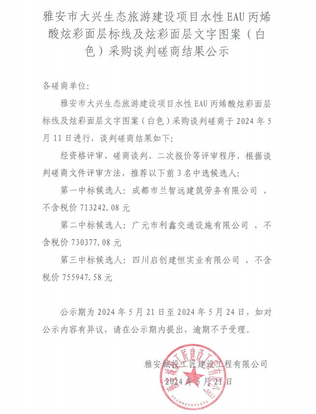 雅安市大興生態(tài)旅游建設(shè)項(xiàng)目水性EAU丙烯酸炫彩面層標(biāo)線及炫彩面層文字圖案(白色)采購(gòu)談判磋商結(jié)果公示