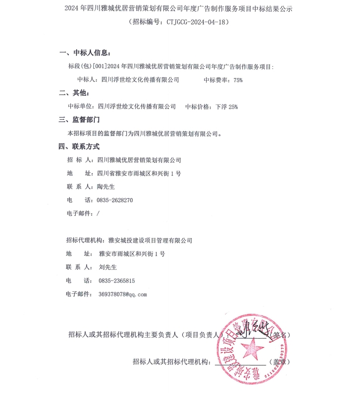 2024年四川雅城優(yōu)居營(yíng)銷(xiāo)策劃有限公司年度廣告制作服務(wù)項(xiàng)目中標(biāo)結(jié)果公示