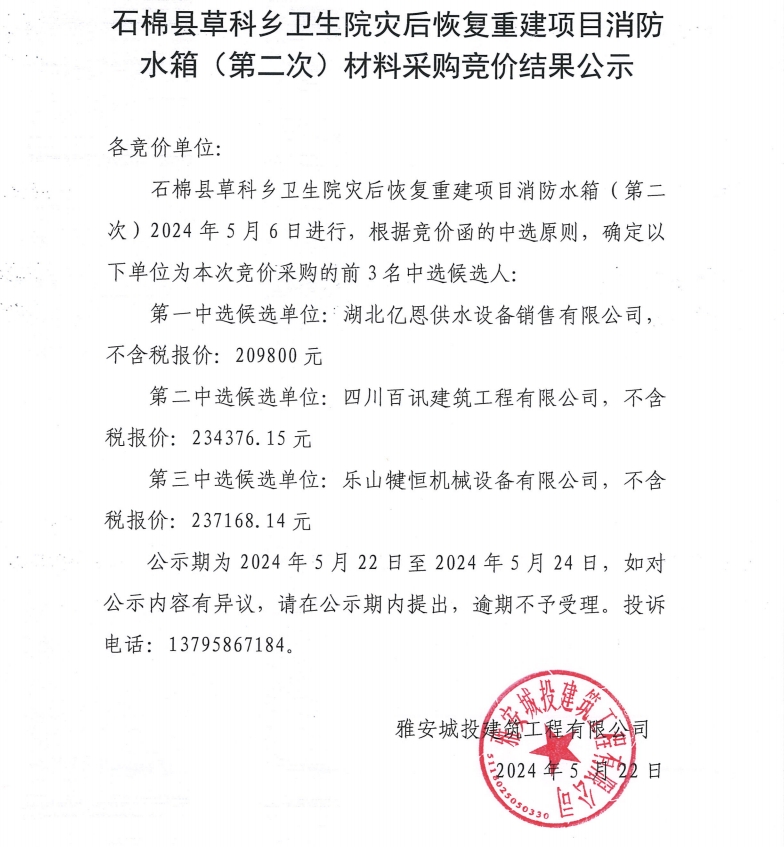 石棉縣草科鄉(xiāng)衛(wèi)生院災(zāi)后恢復(fù)重建項目消防水箱(第二次)材料采購競價結(jié)果公示