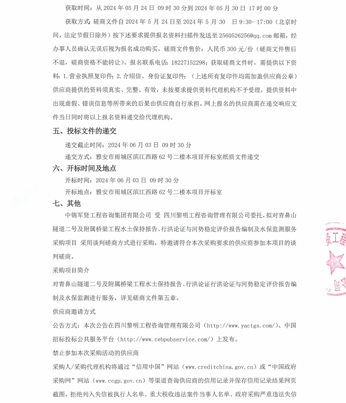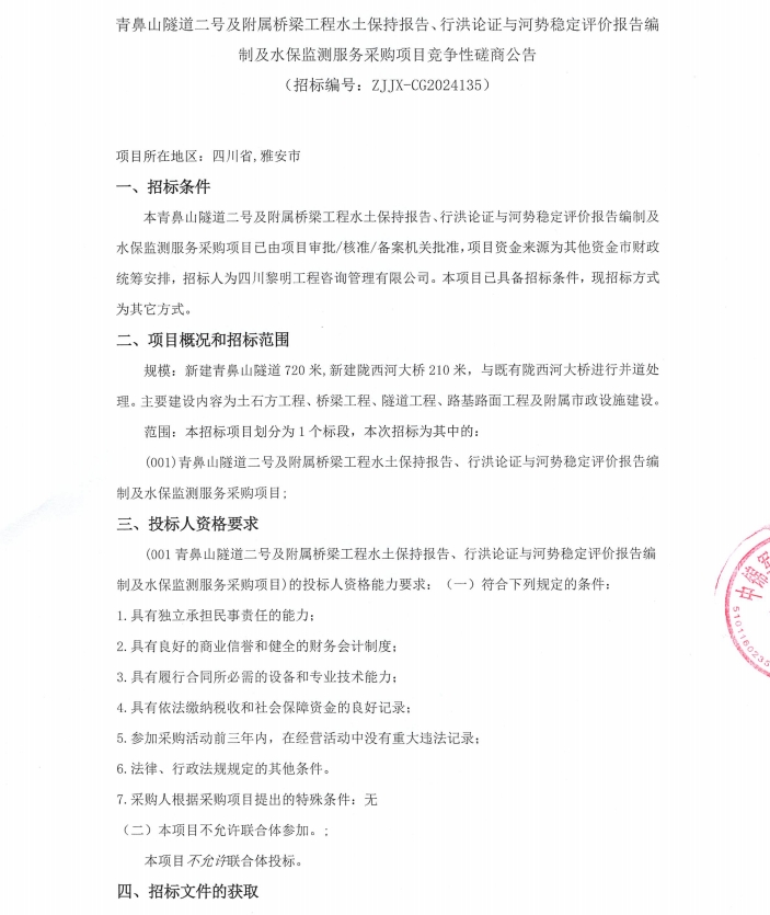 青鼻山隧道二號及附屬橋梁工程水土保持報告、行洪論證與河勢穩(wěn)定評價報告編制及水保監(jiān)測服務(wù)采購項目競爭性磋商公告