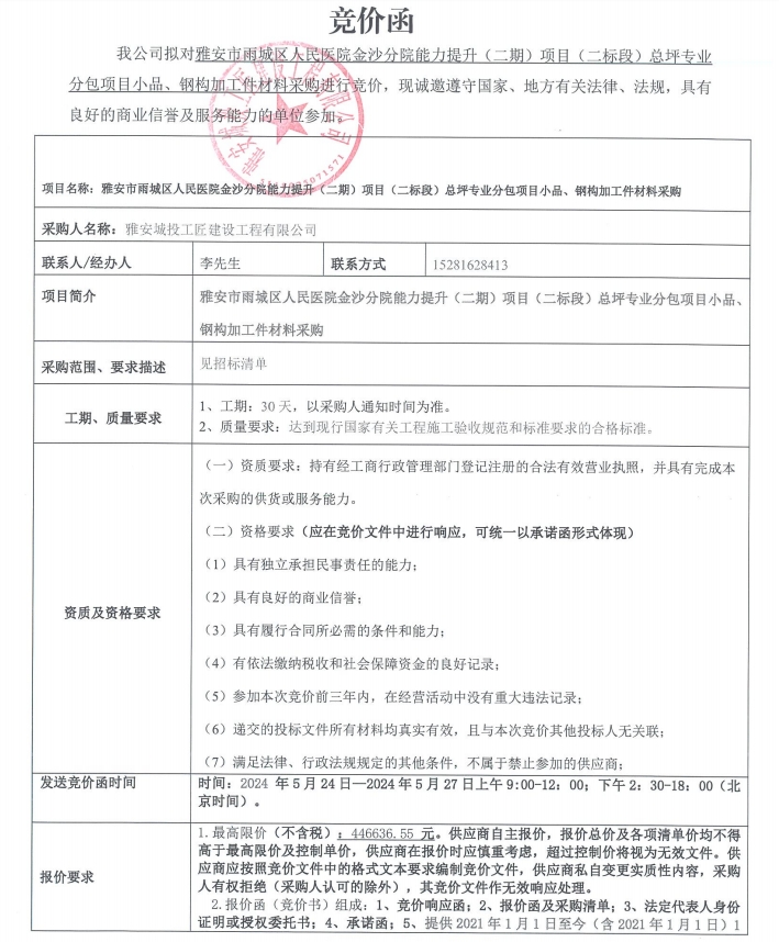 雅安市雨城區(qū)人民醫(yī)院金沙分院能力提升(二期)項(xiàng)目(二標(biāo)段)總坪專業(yè)分包項(xiàng)目小品、鋼構(gòu)加工件材料采購競價函