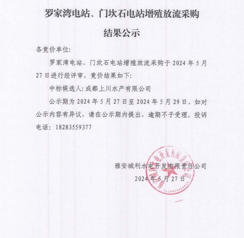 羅家灣電站、門坎石電站增殖放流采購結(jié)果公示