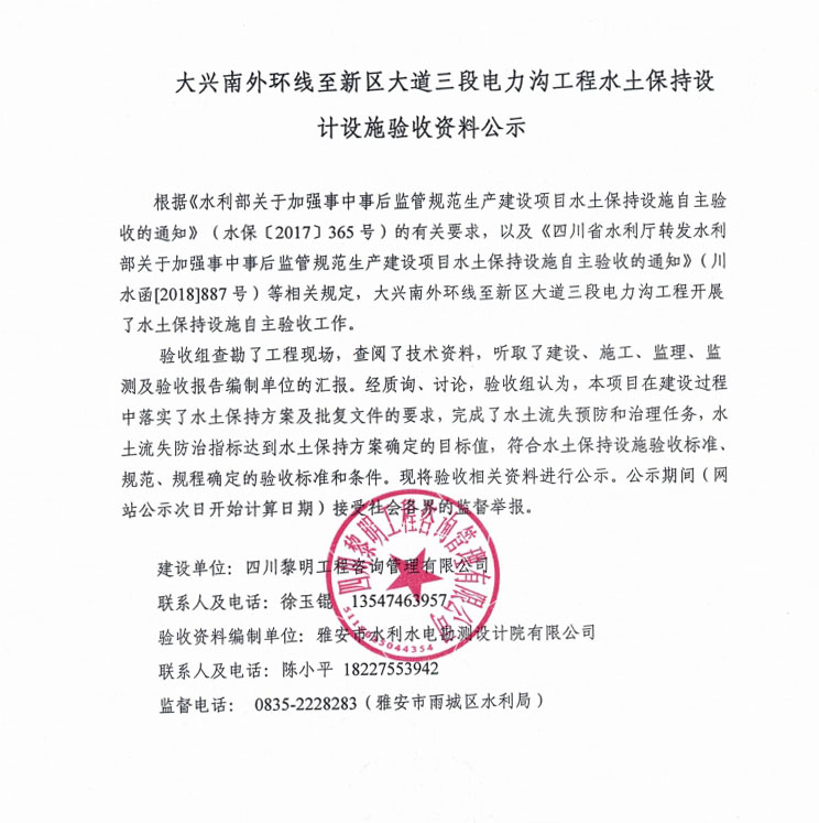 大興南外環(huán)線至新區(qū)大道三段電力溝工程水土保持設(shè)計設(shè)施驗收資料公示