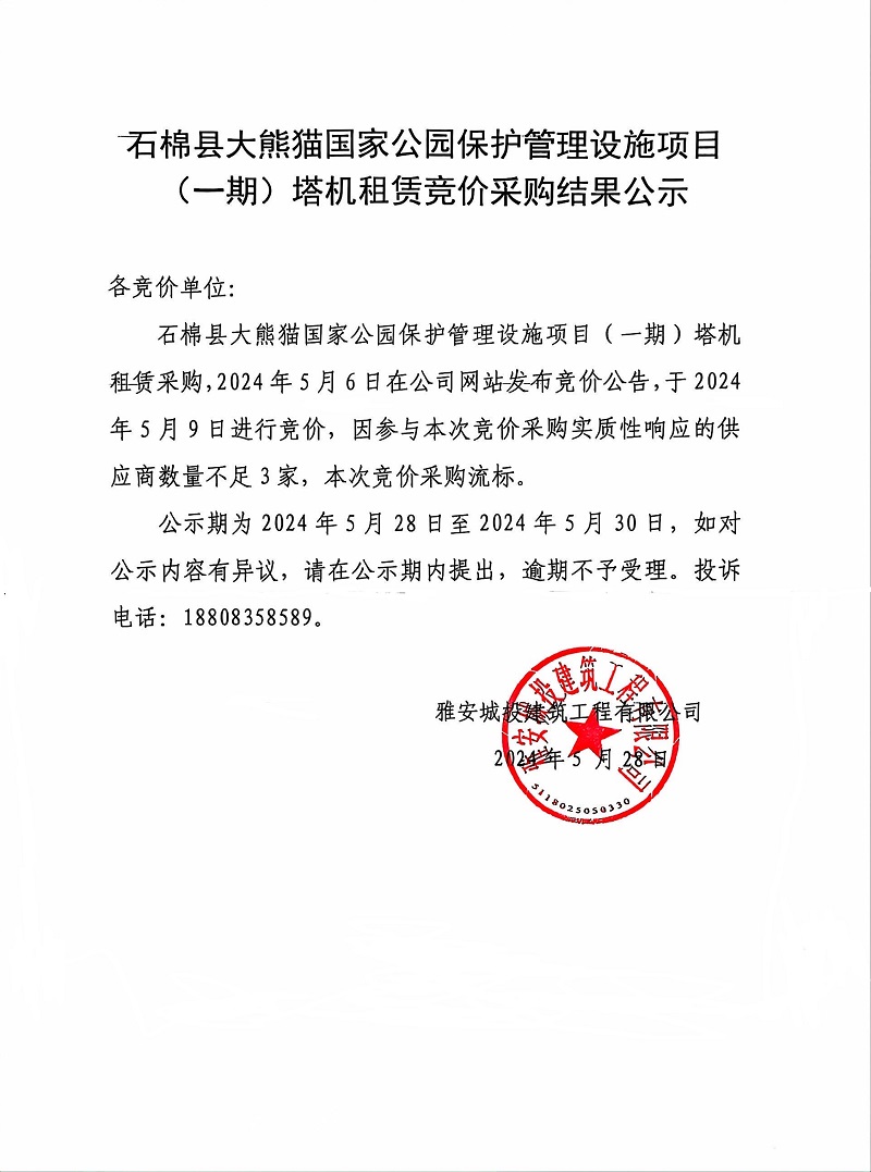 石棉縣大熊貓國家公園保護(hù)管理設(shè)施項(xiàng)目(一期)塔機(jī)租賃競價(jià)采購結(jié)果公示
