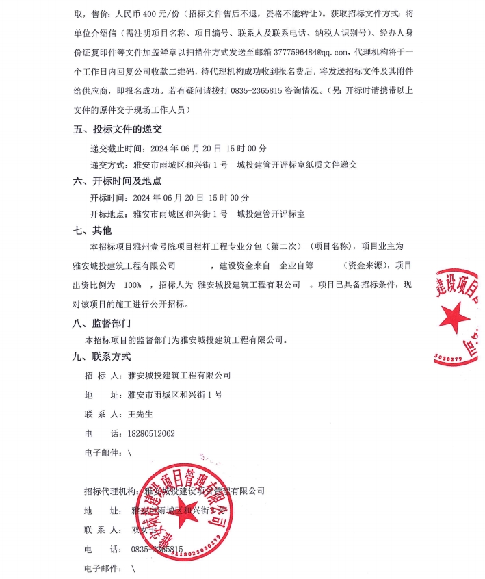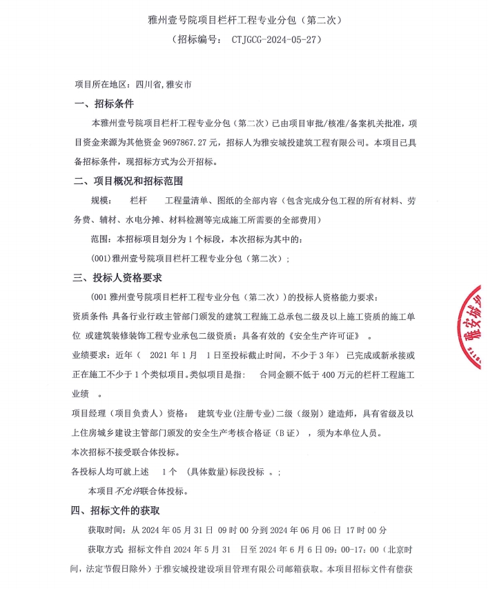 雅州壹號院項目欄桿工程專業(yè)分包(第二次)公告