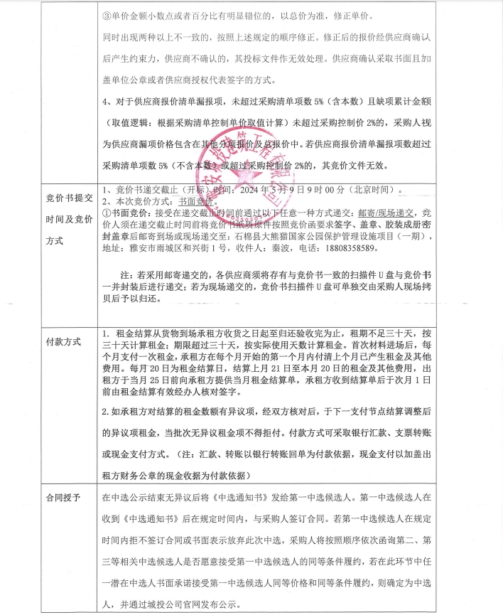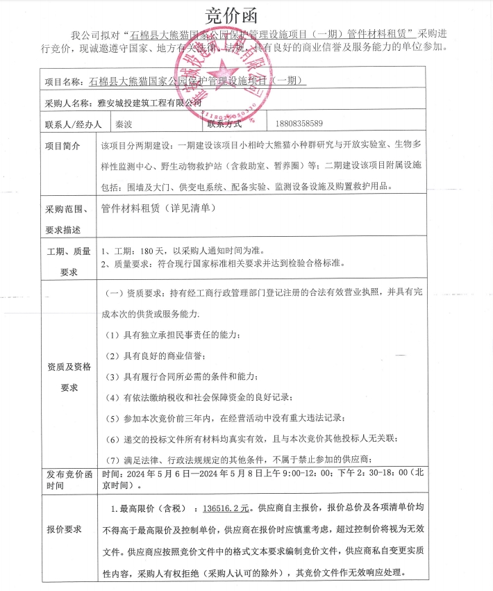 石棉縣大熊貓國家公園保護(hù)管理設(shè)施項目(一期)管件材料租賃采購競價公告