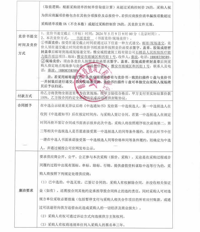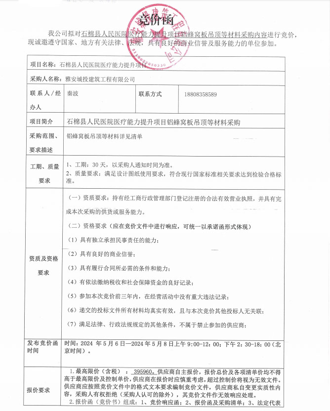 石棉縣人民醫(yī)院醫(yī)療能力提升項目鋁蜂窩板吊頂等材料采購內容競價公告