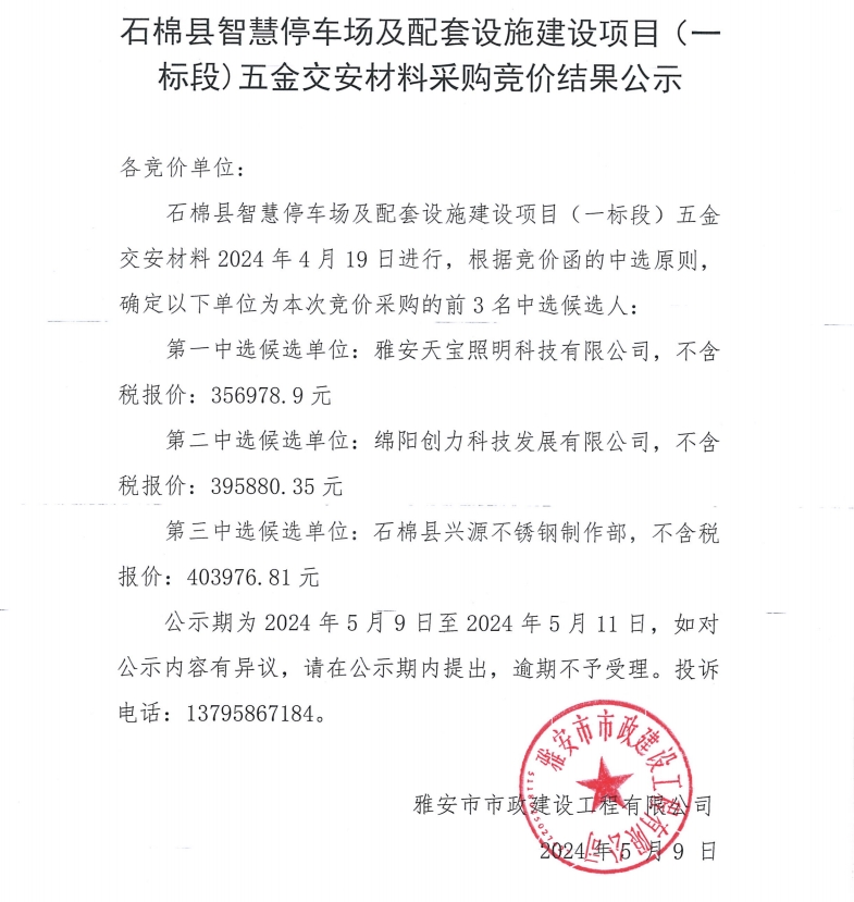 石棉縣智慧停車場及配套設(shè)施建設(shè)項(xiàng)目(一標(biāo)段)五金交安材料采購競價(jià)結(jié)果公示