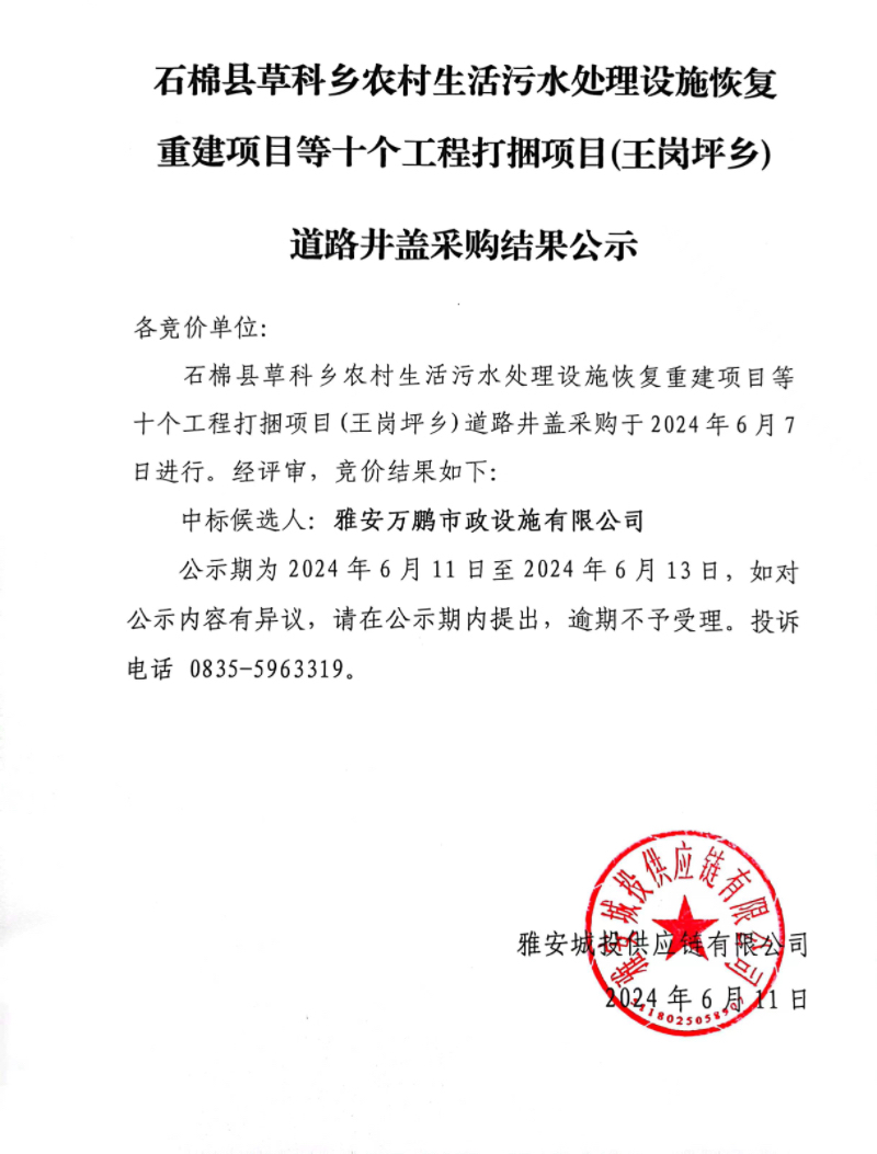 石棉縣草科鄉(xiāng)農(nóng)村生活污水處理設(shè)施恢復(fù)重建項(xiàng)目等十個(gè)工程打捆項(xiàng)目(王崗坪鄉(xiāng))道路井蓋采購結(jié)果公示