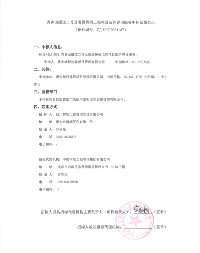 青鼻山隧道二號及附屬橋梁工程項(xiàng)目造價(jià)咨詢服務(wù)中標(biāo)結(jié)果公示