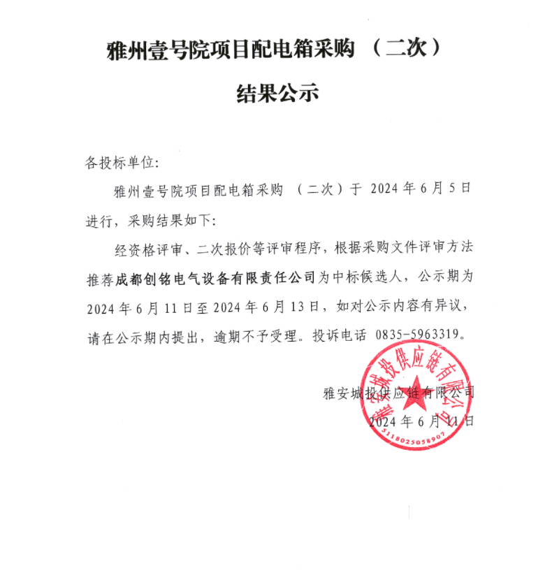 雅州壹號(hào)院項(xiàng)目配電箱采購(gòu)(二次)結(jié)果公示