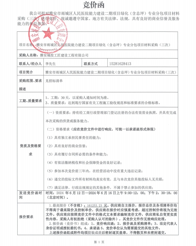 雅安市雨城區(qū)人民醫(yī)院能力建設(shè)二期項(xiàng)目綠化(含總坪)專業(yè)分包項(xiàng)目材料采購(三次)競(jìng)價(jià)公告