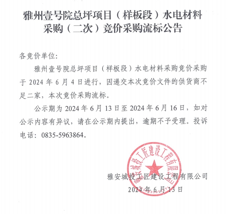 雅州壹號院總坪項(xiàng)目(樣板段)水電材料采購(二次)競價(jià)采購流標(biāo)公告