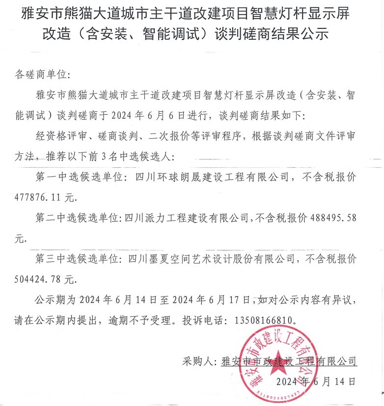 雅安市熊貓大道城市主干道改建項目智慧燈桿顯示屏改造(含安裝、智能調(diào)試)談判磋商結(jié)果公示