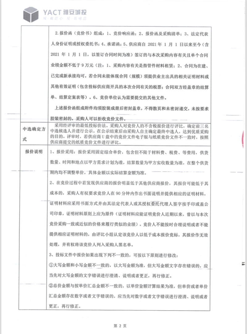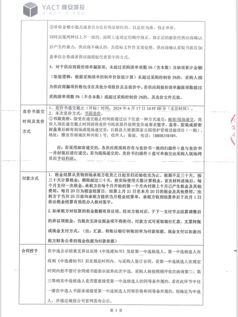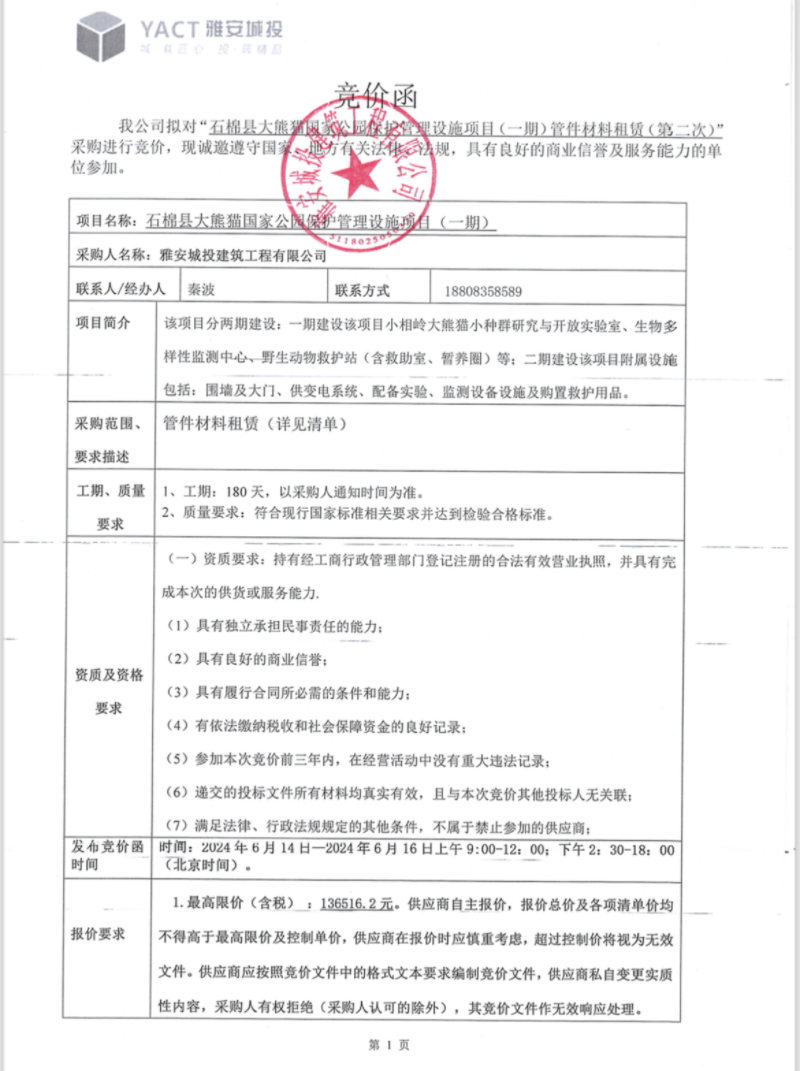 石棉縣大熊貓國家公園保護(hù)管理設(shè)施項目(一期)管件材料租賃(第二次)競價公告