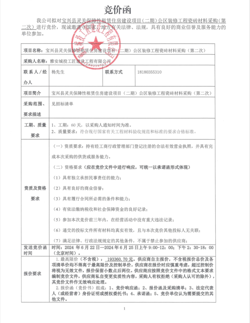 寶興縣靈關保障性租賃住房建設項目(二期)公區(qū)裝修工程瓷磚材料采購(第二次)競價公告