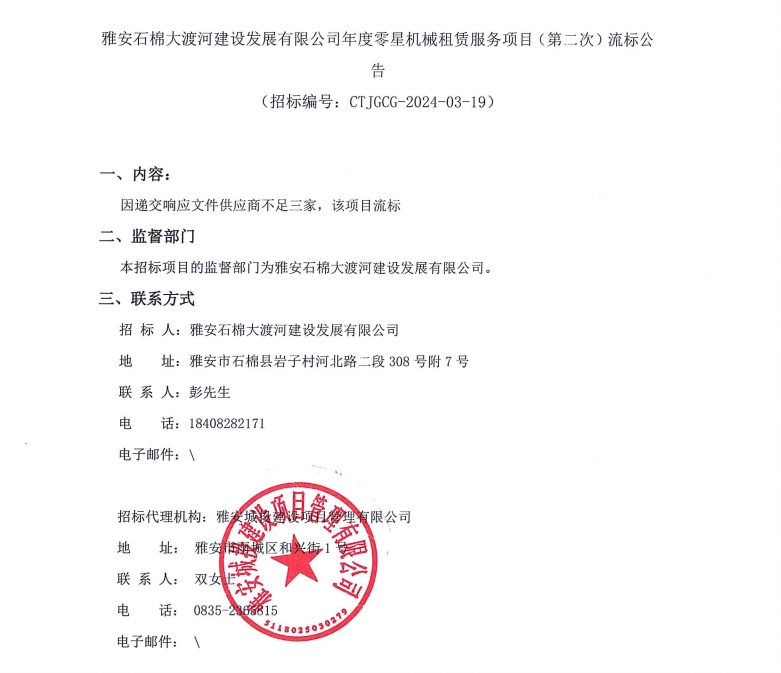 雅安石棉大渡河建設(shè)發(fā)展有限公司年度零星機(jī)械租賃服務(wù)項目(第二次)流標(biāo)公告